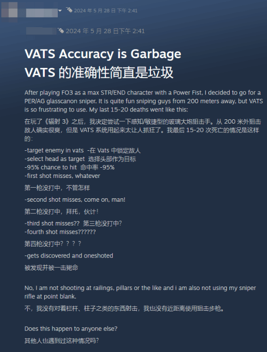 但是多年以来,VATS系统一直存在一个“特性”,那就是显示的命中率和实际的命中率会有所不同,在过去,玩家们普遍会将其解释成游戏设计师刻意设计的机制。